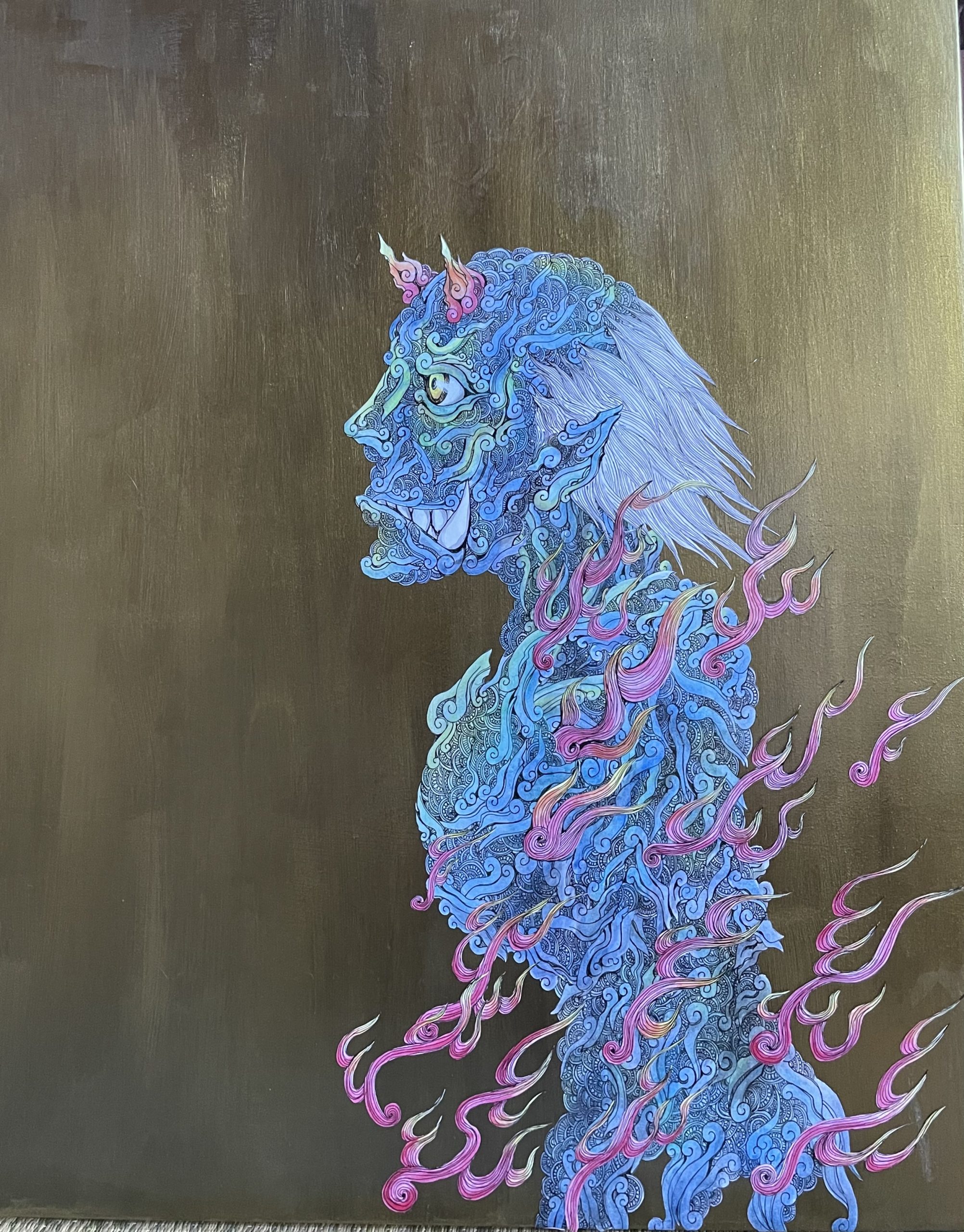 恐ろしさの中にもある美しさを表現したいと思って作品を作っています。ケント紙に絵を描き、パーツを作りそれをパネルに組み合わせて貼り付けて作品を作ります。